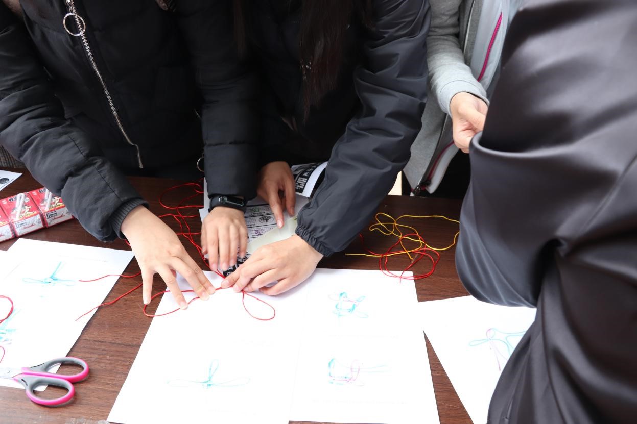 最后一项纺织文化类游戏是穿经织纬大比拼。这个游戏需要参与者利用工作人员提供的小织机完成。参与者一般是三人一组,也有特殊情况,比如,找不到比赛队友的。同学们对小织机很感兴趣,但是不敢轻易尝试。在工作人员的操作示意以及耐心指导下,同学们进而尝试,并完成游戏。