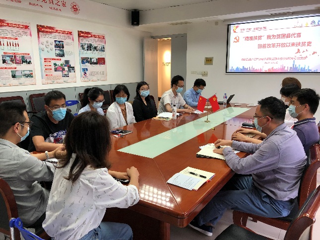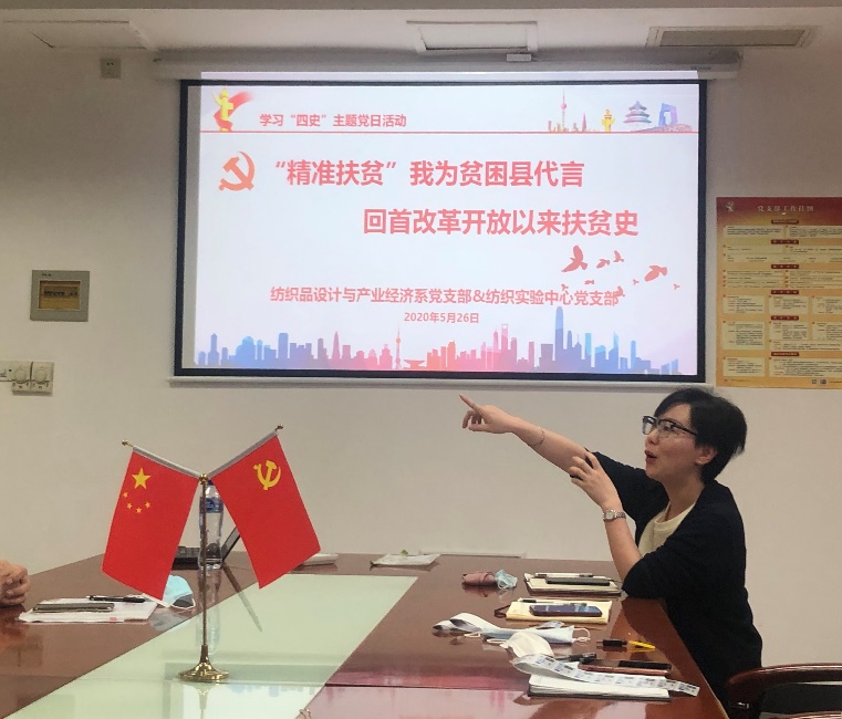 中国扶贫历史是伴随着1978年改革开放,至今已有42年的历史。在2013年习总书记提出“精准扶贫”,从此开展了近7年的“扶贫攻坚战”。为更好地学习党史、新中国史、改革开放史、社会主义发展史, 5月26日下午纺织品设计与产业经济系党支部联合纺织实验中心党支部举行了“四史”学习教育主题党日活动之“精准扶贫”我为贫困县代言,回首改革开放以来扶贫史,帮助党员深化对改革开放史的理解,并进一步强化脱贫攻坚政治责任。活动邀请了91成人专职党务干部寿晨燕以及曾代表学校在盐津县庙坝镇黄草社区第一书记岗位上挂职2年的辅导员张强,纺织品设计与产业经济系党支部与实验中心党支部全体党员参加。
